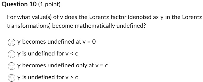 Solved Question 10 1 Point For What Valuels Of V Does The Lorentz Factor Denoted As Y In The Lorentz Transformations Become Mathematically Undefined Y Becomes Undefined At V 0 Y Is